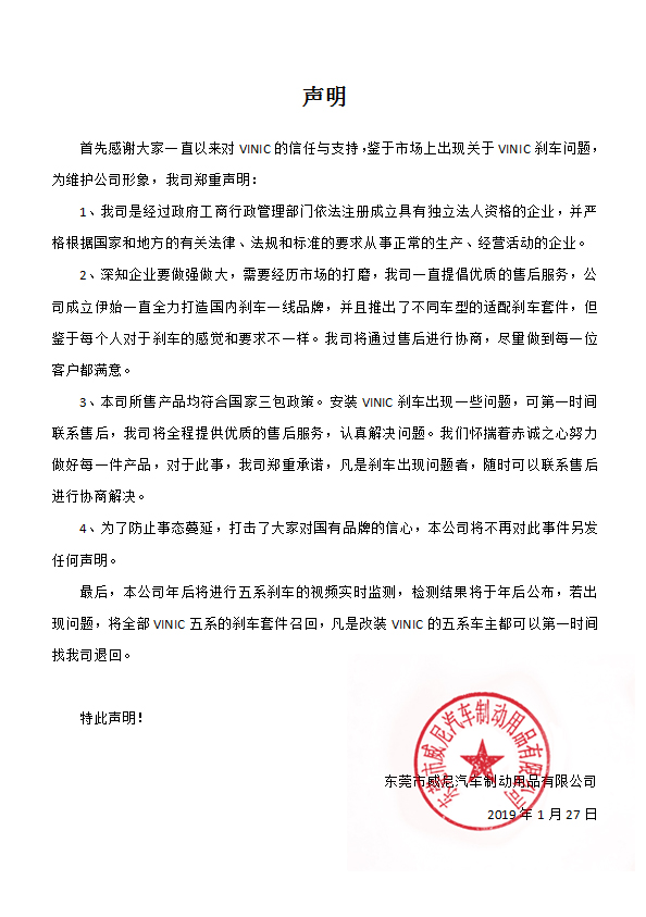- 威尼汽車制動用品有限公司 產(chǎn)品包裝更換聲明 2019-07-01
